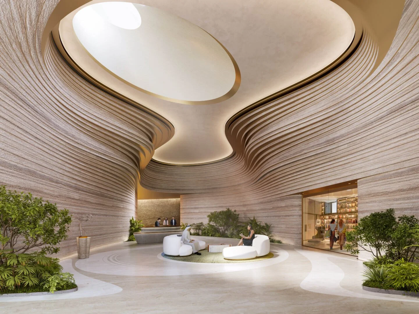 Supported by The Grove’s interconnecting podium is an elevated landscape of sheltered walkways, verdant gardens and terraces with infinity pools offering residents and guests uninterrupted views across the bay. The residents' members’ club, wellness center, entertainment lounge and other amenities are located at this level to directly connect with this elevated landscape.